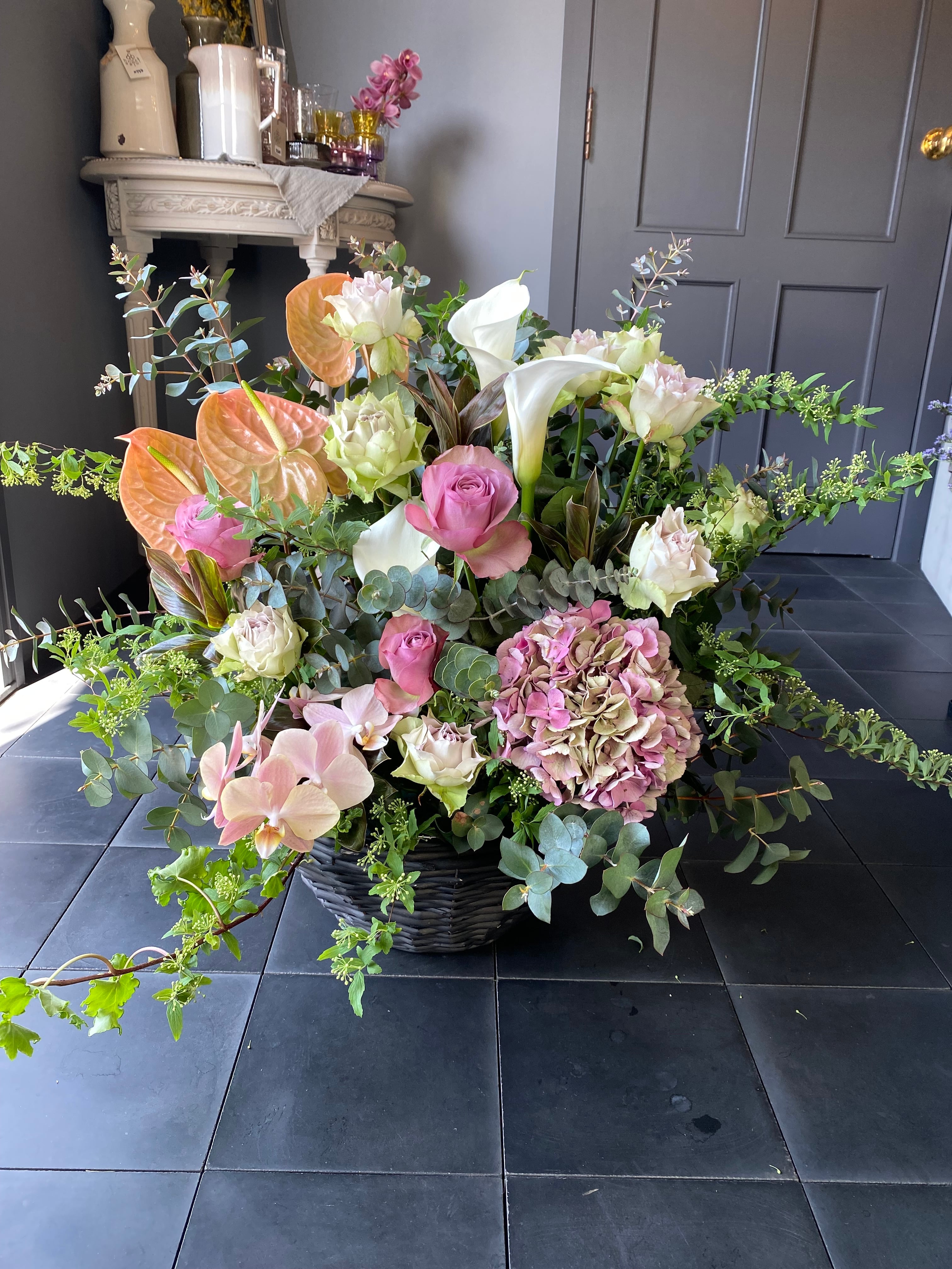 ボリューム感が魅力の季節のアレンジメント(L)が登場しました。大きな籠に季節のお花や緑をふんだんに使い、存在感のあるアレンジメントに仕上げました。リビングや玄関など、お部屋のアクセントにピッタリです。贈り物にも最適で、大切な人へのプレゼントとしても喜ばれること間違いなし。季節ごとに異なる花材を使用しており、その時々の素敵な色彩と香りを楽しむことができます。